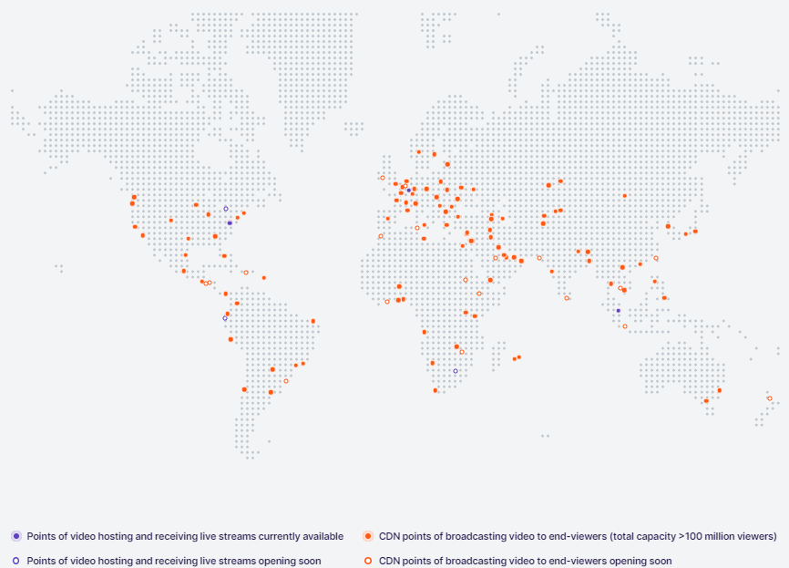 - Live broadcasts for vertical and horizontal videos with low latency anywhere in the world